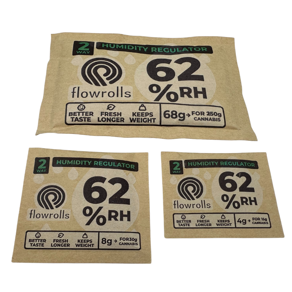 Regulatory wilgotności Flowrolls 62% zostały stworzone z myślą o przechowywaniu suszu CBD, medycznej marihuany oraz innych delikatnych materiałów roślinnych. Korzystają z dwukierunkowej technologii pochłaniania i oddawania wilgoci, która automatycznie stabilizuje poziom RH w pojemniku na wartości około 62% — idealnej do zachowania pełnego aromatu, struktury i jakości ziół.